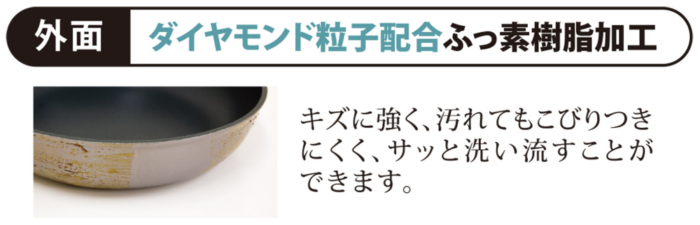 【外面はダイヤモンド粒子配合ふっ素樹脂加工】キズに強く、汚れてもこびりつきにくく、サッと洗い流すことができます。
