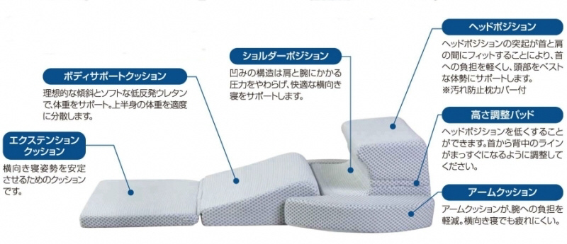 オーストラリアのスインバーン大学が開発した6つに分かれた独自フォルム。適度な傾斜と凹凸構造が首・肩・腕にかかる負担をやわらげ、快適な横向き値をサポートします。
