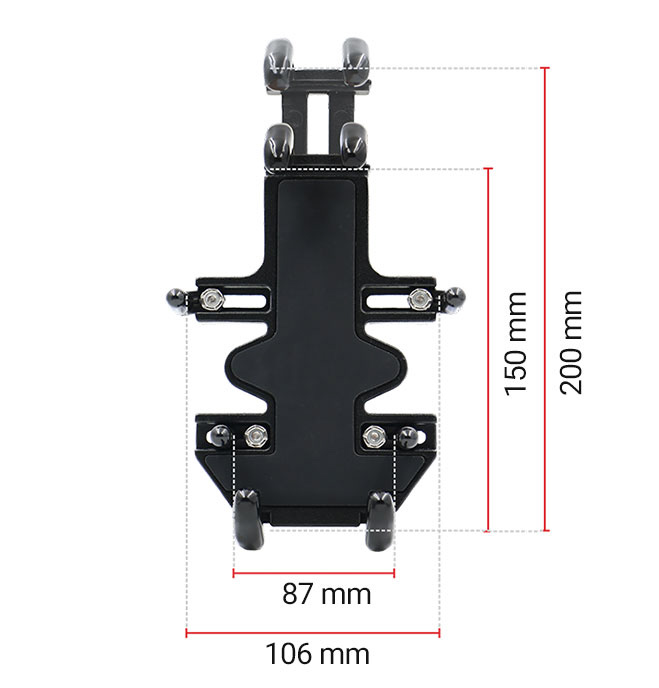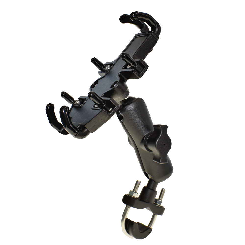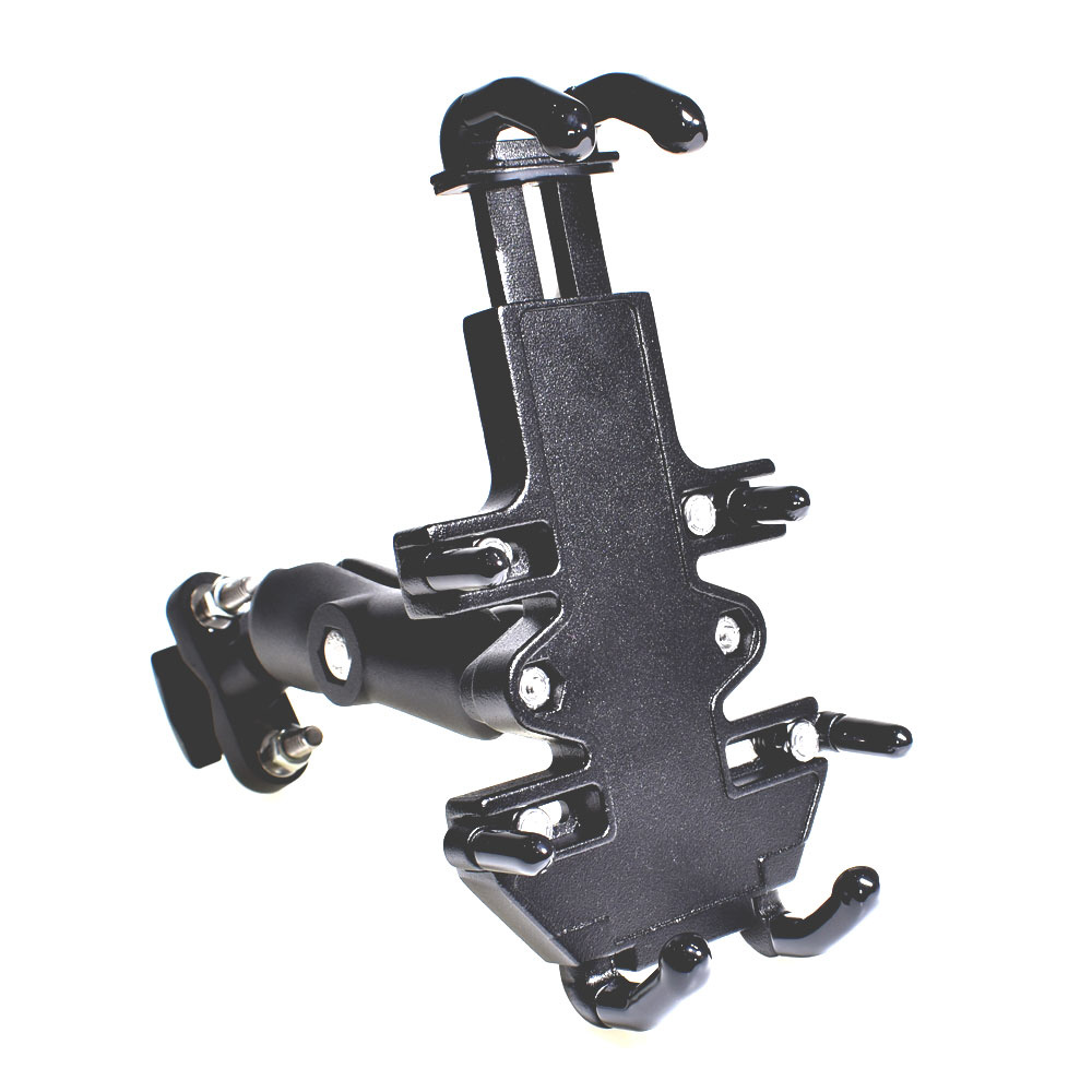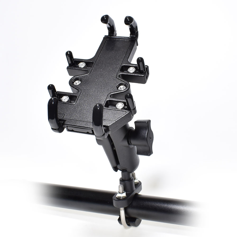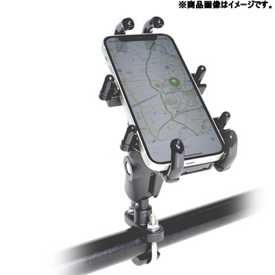バイクや自転車のバーに装着するスマホマウントです。アルミ合金製でしっかりと固定でき、頑丈で安心感があります。スマホを抑える爪部分は傷がつきにくいようにゴムでカバーされています。