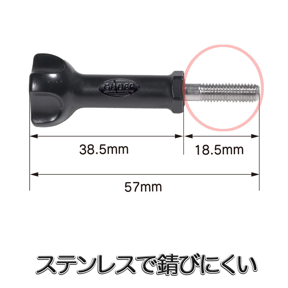 通常の長ネジはGoPro純正メディア モジュラーに使用すると、ネジ部分の隙間がなく締めにくいですが、GLIDERの長ネジは通常の長ネジより長く、締めやすいデザインになっています。