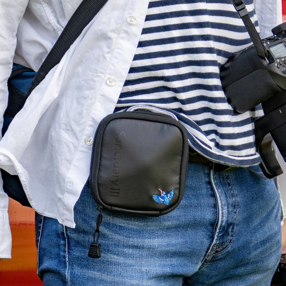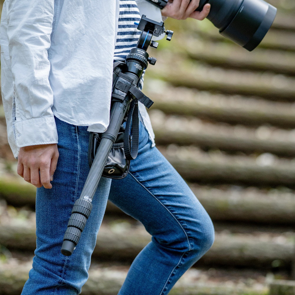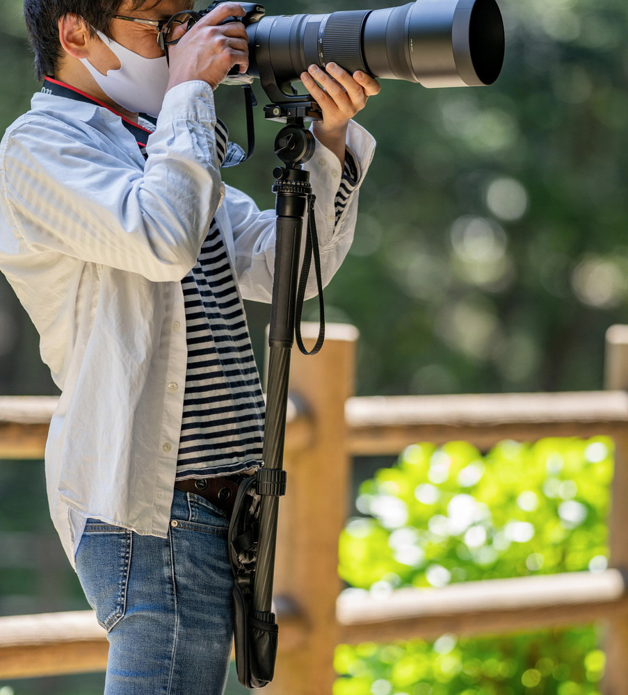 一脚を腰にホールドして持ち運びが可能。一脚ポケットを活用すれば、体と一脚で逆三角形のフォームを形成し、ブレにくく野鳥や航空機の撮影ができます。