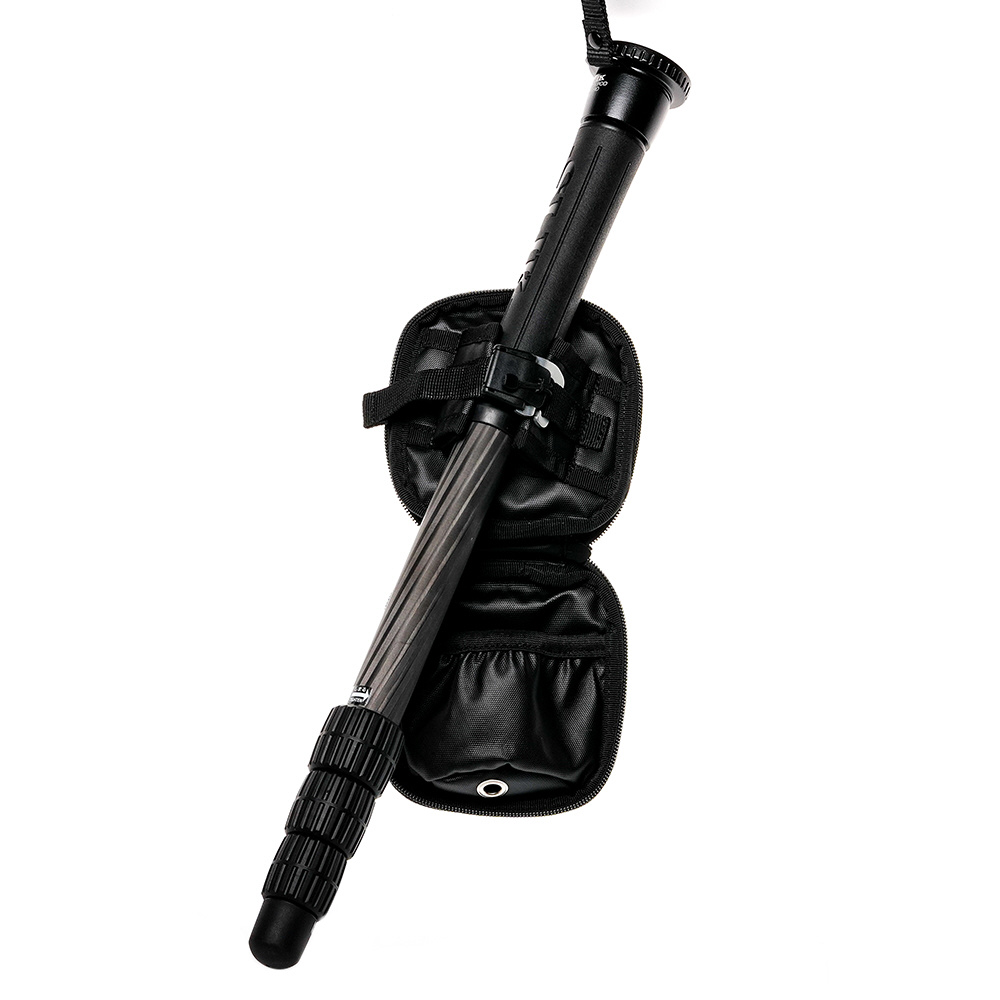 一脚ホルスターを装備、一脚を刀のように斜めに装着することで、移動時に一脚を安定して持ち運びことができ、両手を自由に。