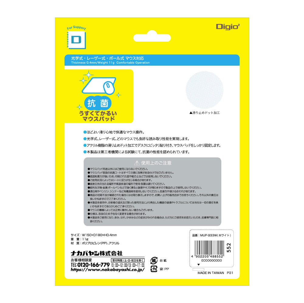 MUP-933W マウスパッド [150x180x0.4mm] 抗菌 ホワイト