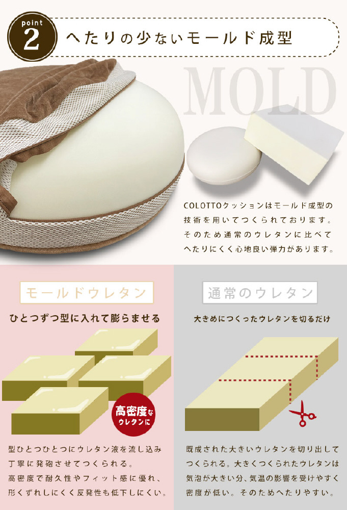 ひとつひとつ丁寧にウレタンを膨らませて発砲させる方法で作っているため、高密度で心地よい弾力になります。