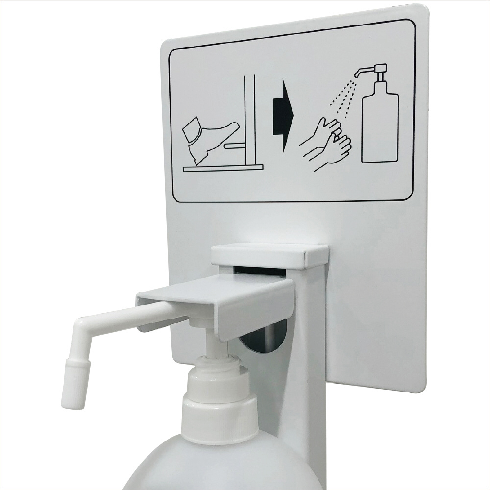 足踏みペダルを踏むだけでポンプに触れることなく消毒液を噴射!ノズルの向きをコの字型プレートで制御!噴射での床汚れ防止できる受け皿付きの消毒液スタンドになります。