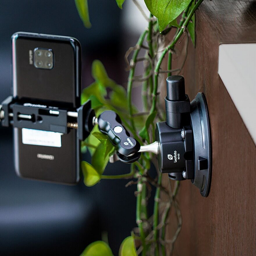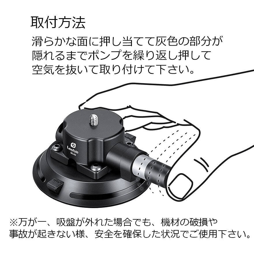ポンプで減圧する事で強力に壁面に取り付けができる吸盤カメラマウント。三脚などが設置できない場所で手軽に機材を固定できます。