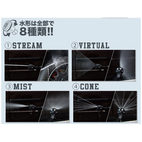 ●8パターンのノズルで様々な用途に対応が可能です。もちろん、洗車以外にも使い方はいろいろ。