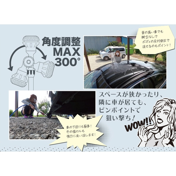 ●放水ヘッドが最大300度に回転が可能。上向きにして車の下回りを放水ができます。