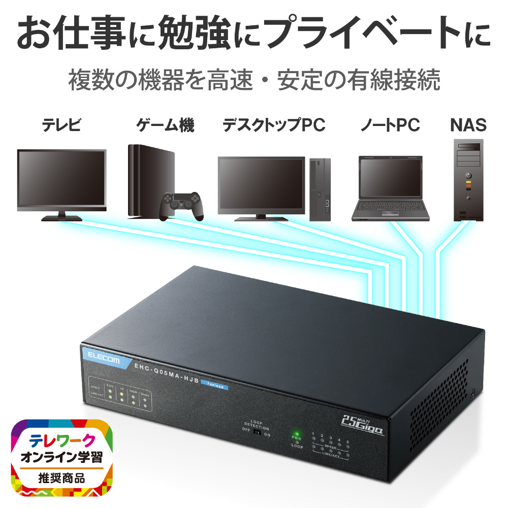 Cat5eケーブルそのままで大幅速度アップし、ストリーミング動画視聴やオンラインゲーム対戦に最適。全ポート2.5ギガ※対応ポート搭載スイッチ。省電力機能で最大約60%節電! ファンレスで耐熱50°Cに対応し、ループ検知機能も搭載した2.5GBASE-T対応の電源外付けメタル筐体5ポートハブ。
