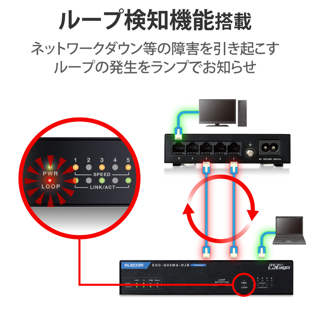 ネットワーク運用に障害を及ぼすループ構成を検知します。 さらに、ループ検知LEDランプの点滅により、ループ発生をお知らせし、ループ解消を促します。