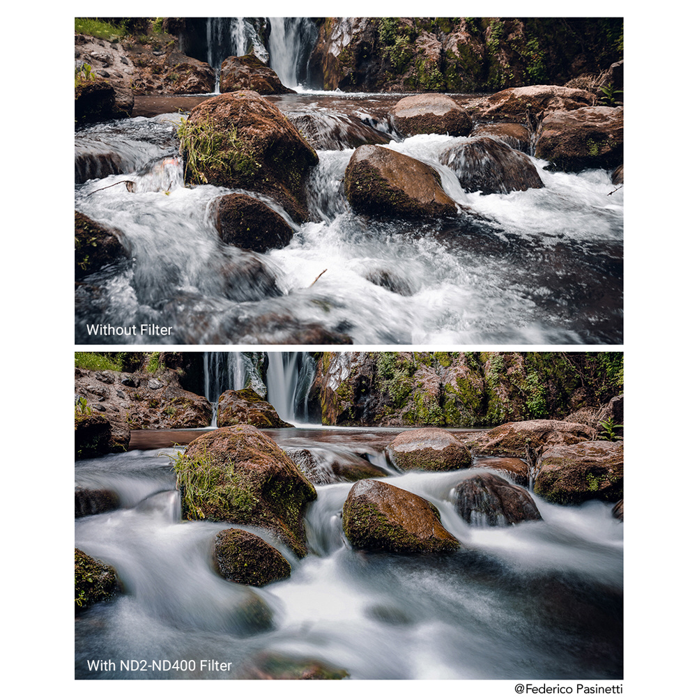 光量は、ND2からND400まで調整でき、撮影によってフィルターを取り替える手間が解消されます。