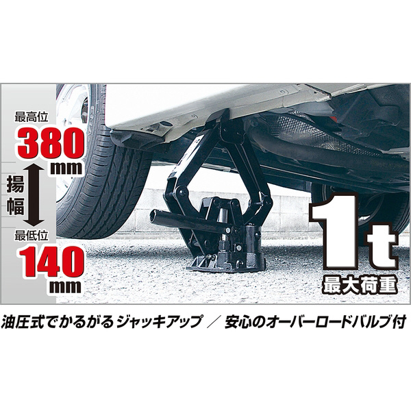 油圧式なので、車載のジャッキに比べ少ない力でジャッキアップが可能。作業時の負担を軽減します。