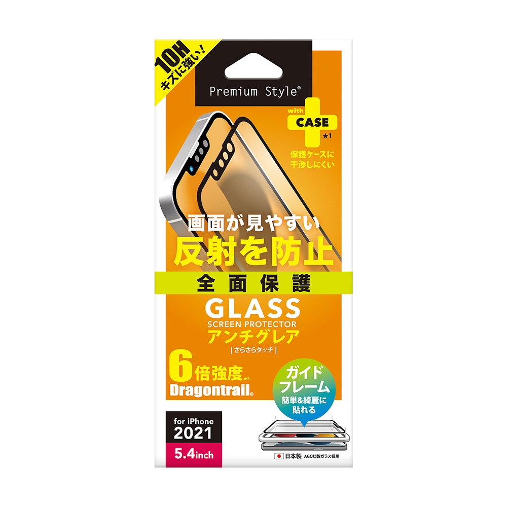 光の反射を抑えて画面が見やすいiPhone 13 mini 用 液晶全面保護ガラスのアンチグレアタイプです。