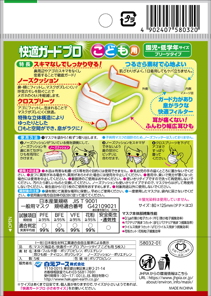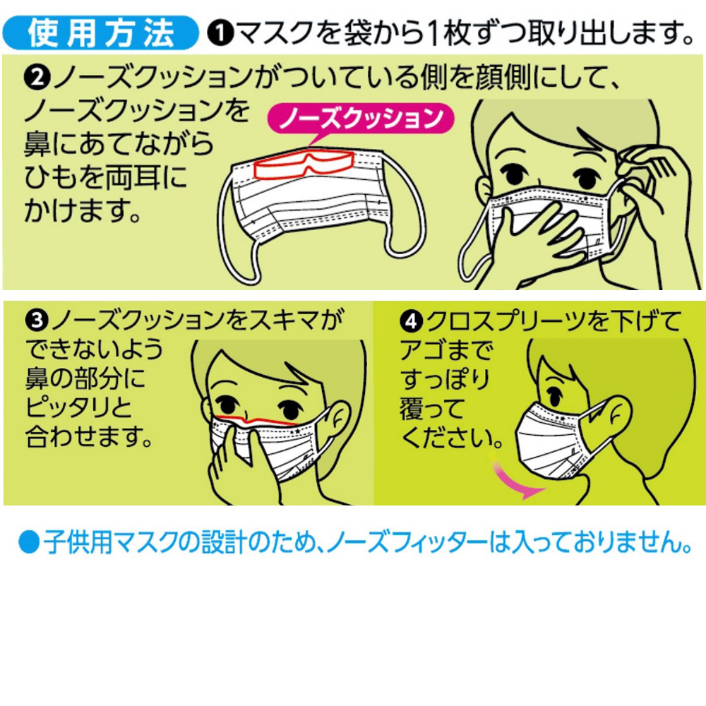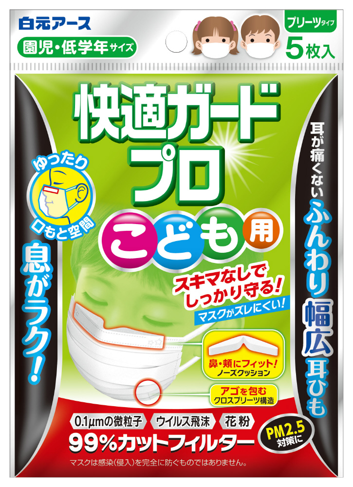 ふんわり幅広耳ひも。0.1μmの微粒子99%カットフィルター。園児〜低学年用。