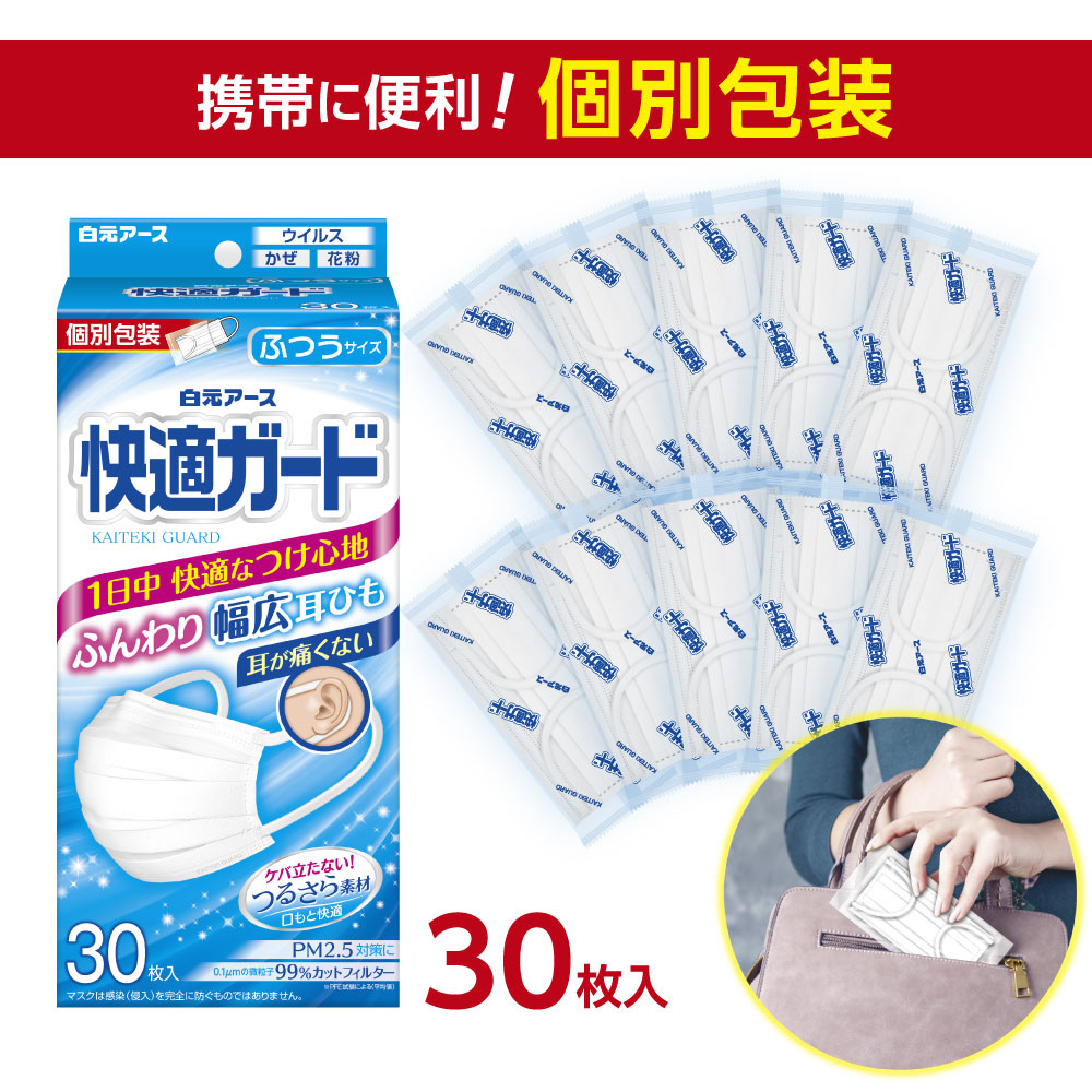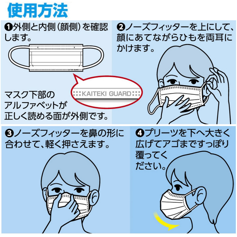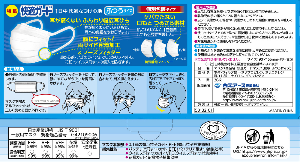 耳が痛くない幅広耳ひもと、肌ざわりがよく、1日着用してもケバ立たない口もとつるさら素材で、1日中快適なつけ心地。