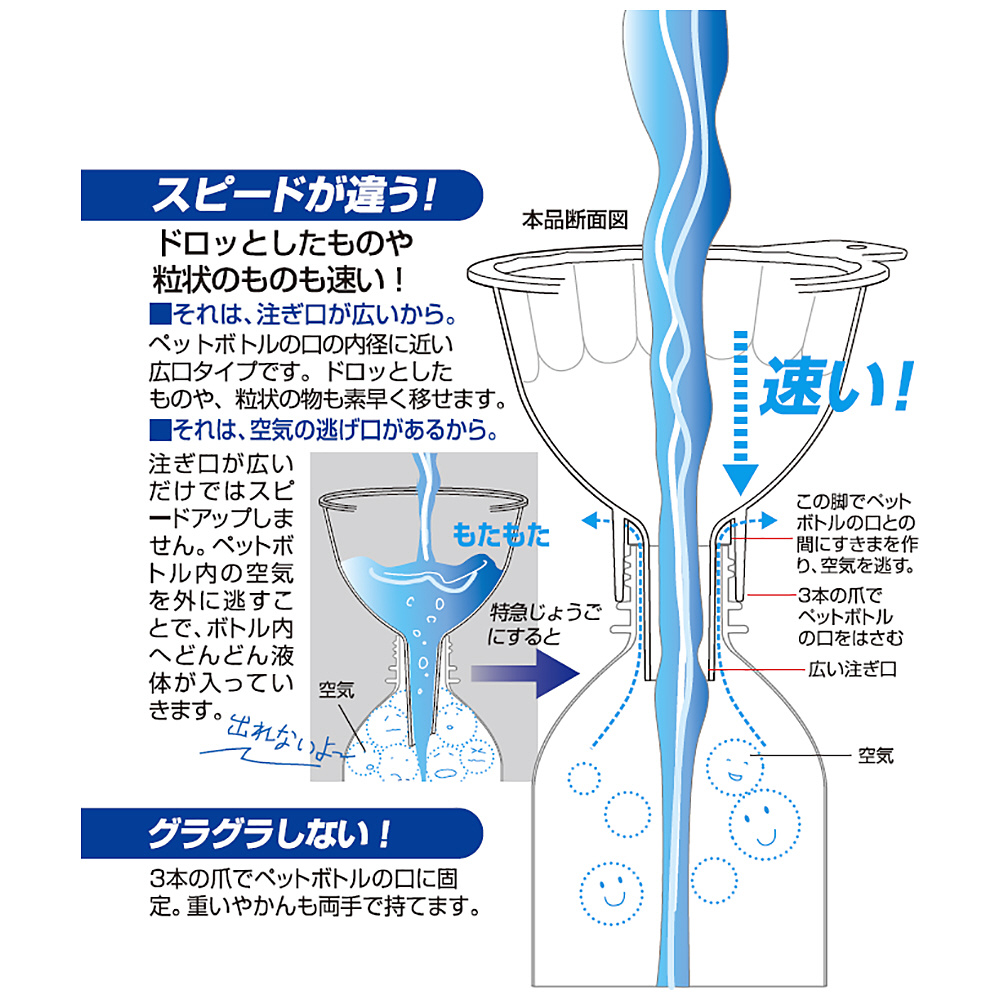 ドロッとしたもの、粒状のものも素早く移し替えができる、ペットボトルに最適!