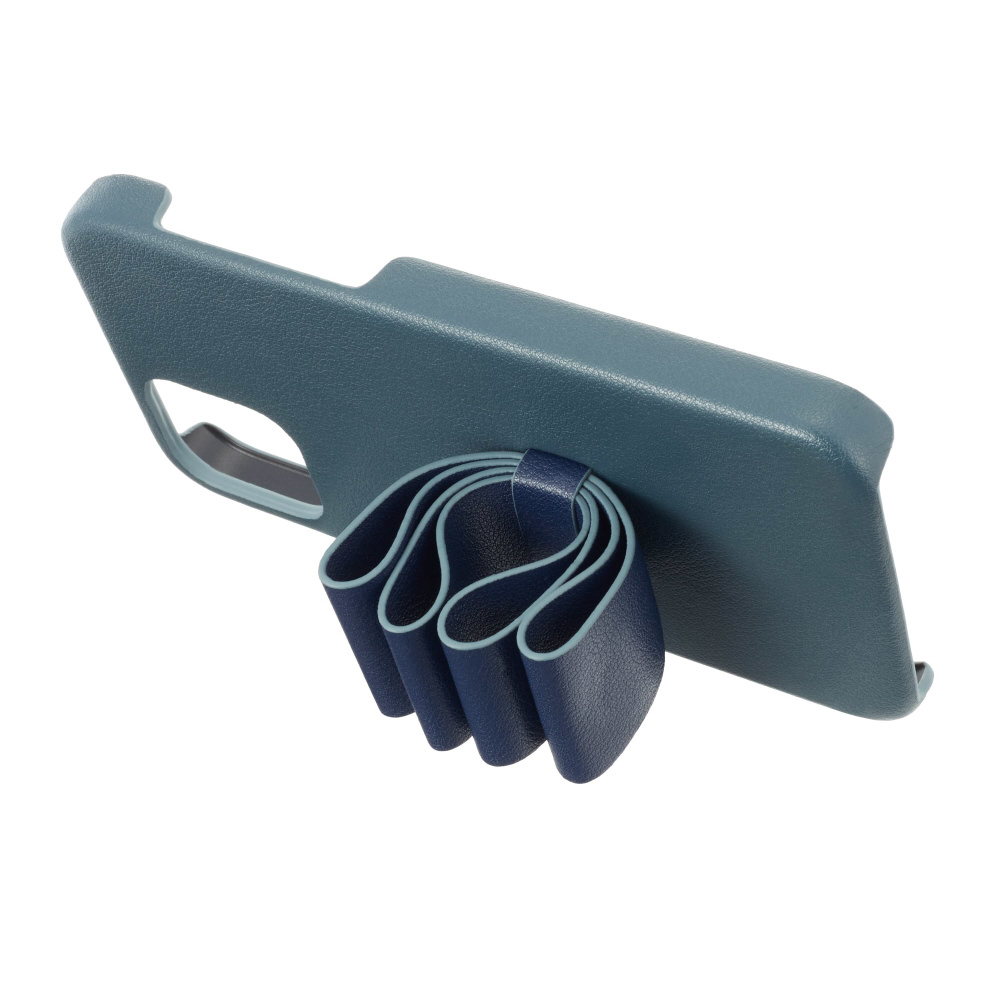 背面のリボンがスタンド機能とリング機能を同時に実現。リボンを畳むと縦にも横にもスタンドとして使用可能でリボンに指を通すとスマホリングのように利用できる優れものです。