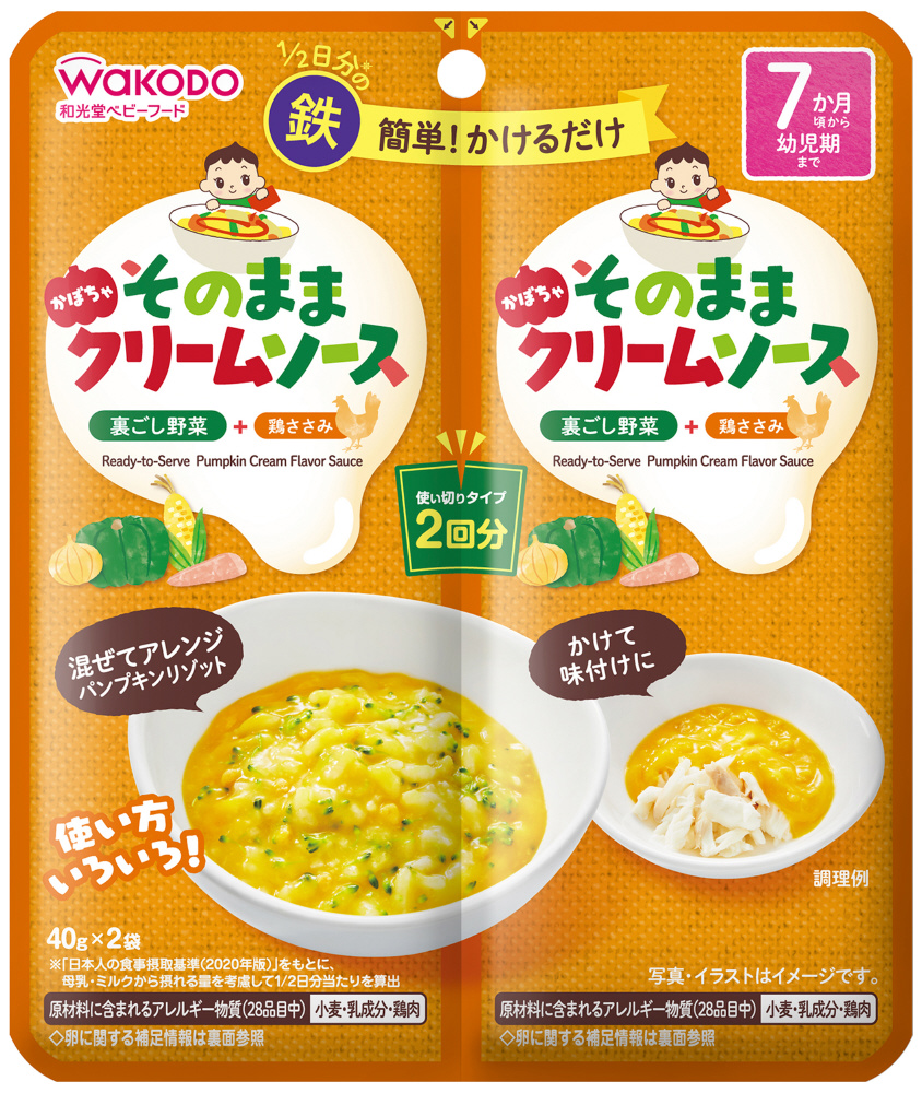原材料名 かぼちゃペースト、鶏肉加工品(鶏肉、パン粉(小麦を含む)、たまねぎ、でん粉、食塩)、鶏ほぐし身、全粉乳、オニオンソテーペースト、砂糖、チキンエキス、バター、とうもろこしペースト、食塩、米酢/増粘剤(加工でん粉)、ピロリン酸鉄