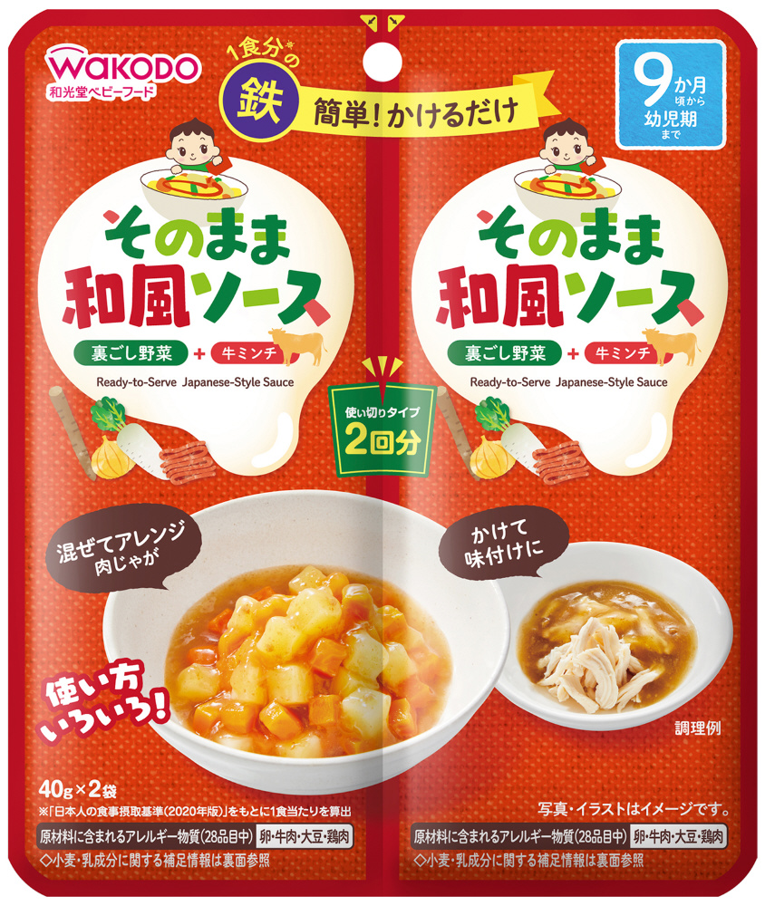ご家庭にある食材、ストック素材等と混ぜたりかけるだけで、簡単にお子様の食事の味付けができる。たんぱく具材(牛ミンチ)と3種類の裏ごし野菜ペースト入り