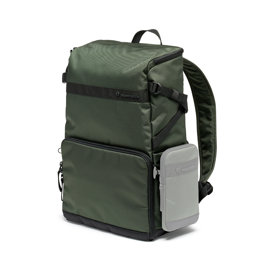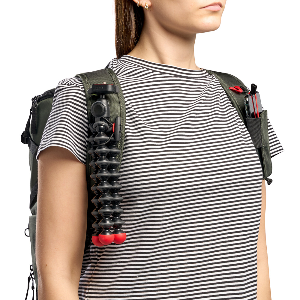 「●普段使いもできるモジュラー式デザイン。レンズを装着したままのカメラと2本の交換レンズを収納可能なカメラコンパートメントは取り外しが可能で、普段使いのバックパックとしても利用することができます。また、14インチまでのノートパソコンに対応したスリーブも、取り外して単独で使用することができます。一方、スマートフォンや小物類の収納に便利な別売のクロスボディポーチをバッグの両サイドに取り付けて、収納力をアップグレードすることも可能です。」