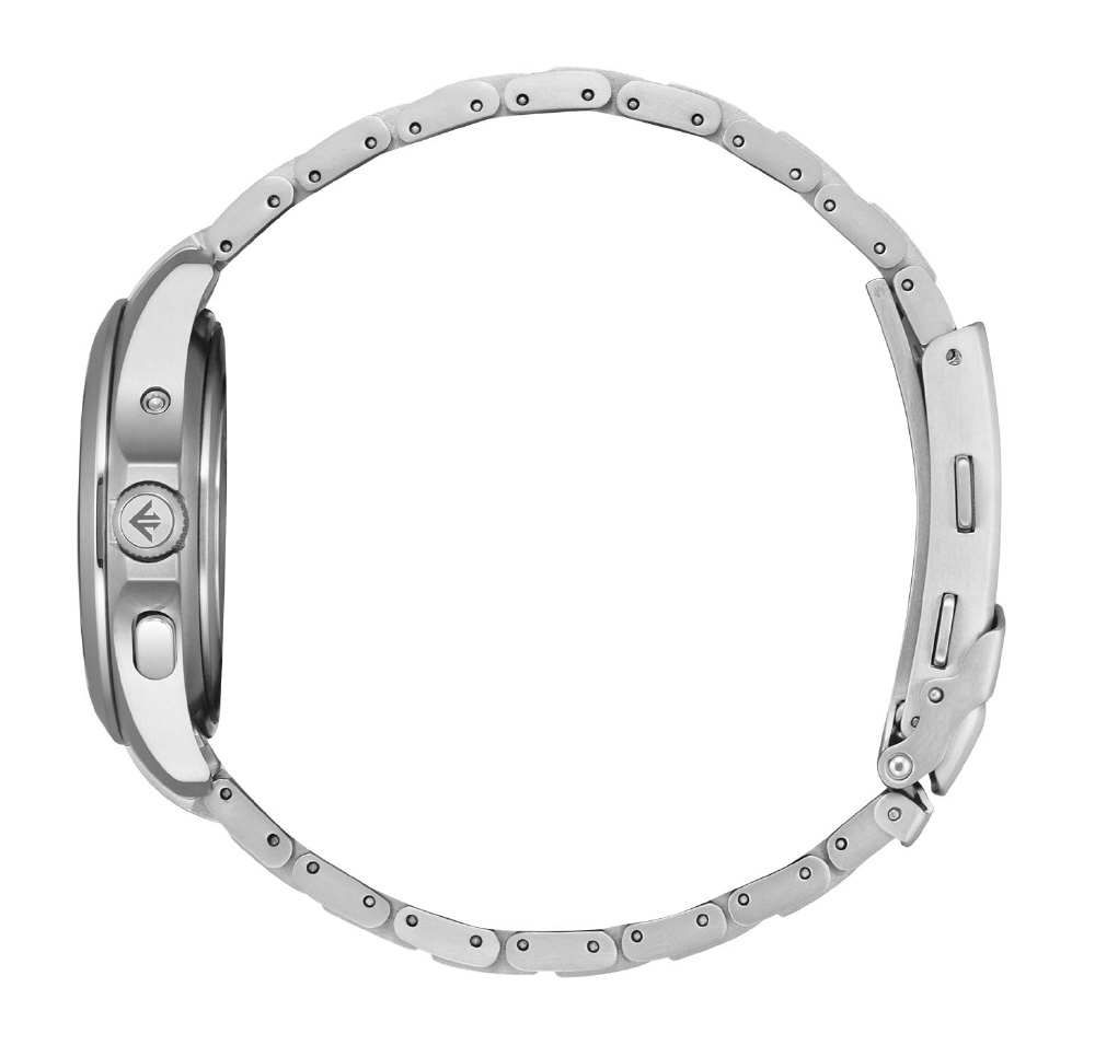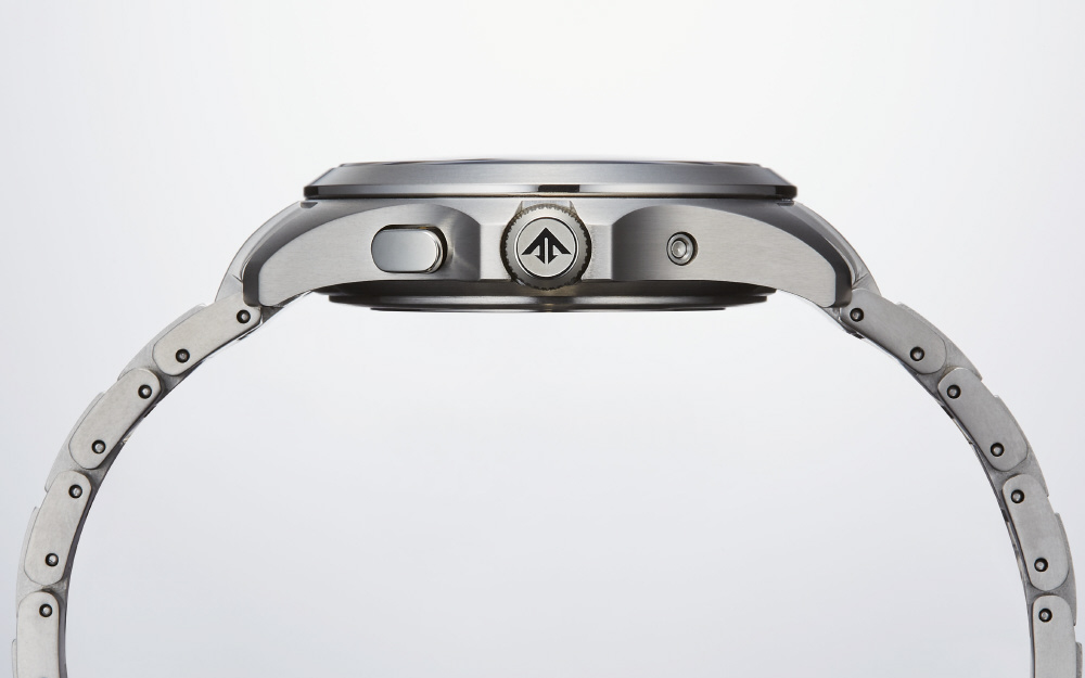 ■ねじロック式のりゅうずは、文目模様を施したミリタリーテイスト仕上げ。シンプルな中にも、さりげないアクセントをプラスしました。