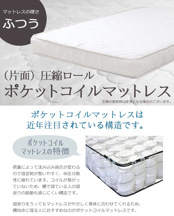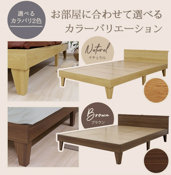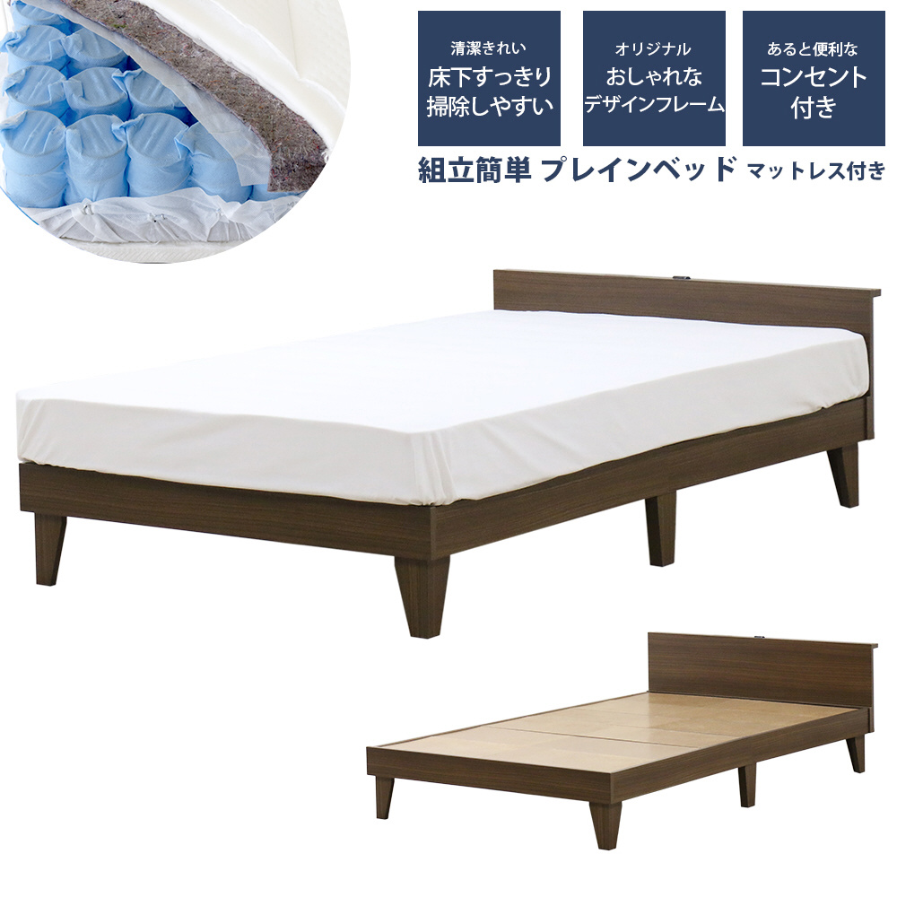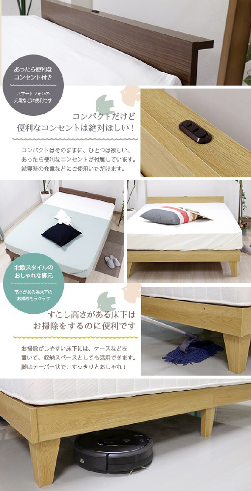 北欧スタイルのシンプルなコンパクトデザインベッドです。コンパクトなヘッドボードには、便利な一口コンセント付き。脚もテーパー状でおしゃれ!レギュラーマットレス付き。