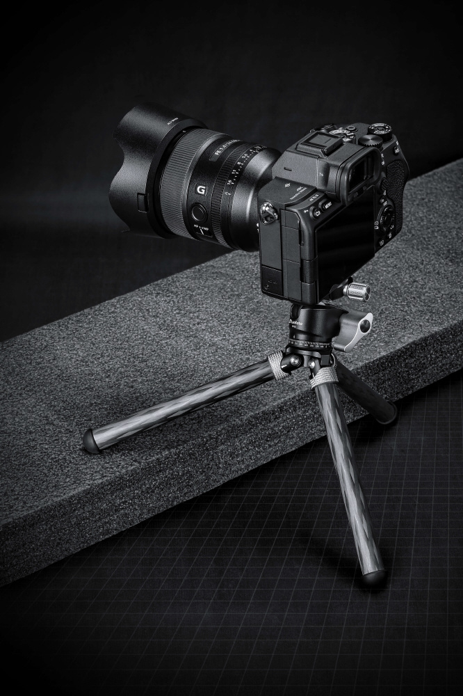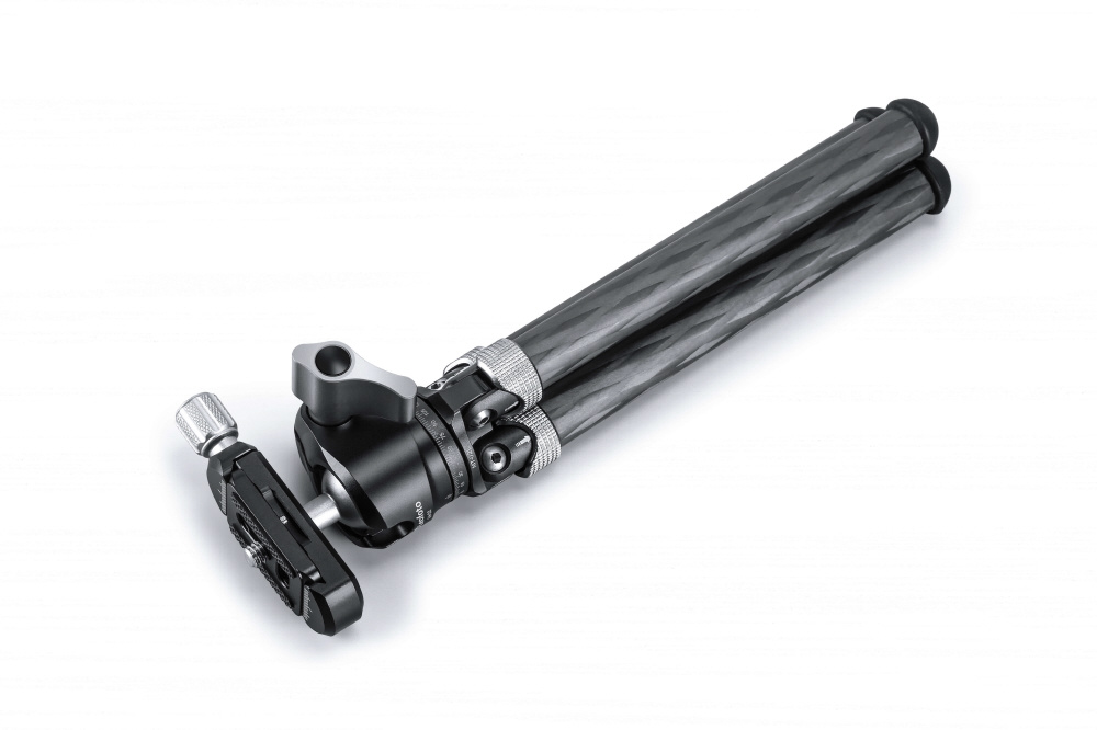 ミニ三脚ながら10層カーボンパイプを採用し耐荷重を犠牲にせず、軽量・小型化を実現。カーボンパイプに塗膜を施すことで、キズや摩耗を防ぎ、耐久性を向上します。三脚の付け根に開脚角度の調整機構を搭載。撮影条件に合わせてワンタッチで開脚角度を調整し、ローポジション撮影に対応します。