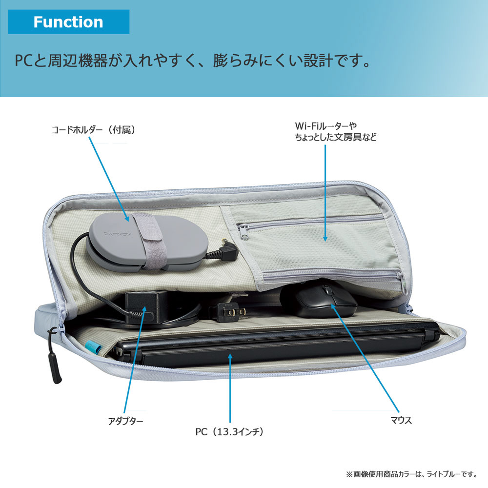 ■パソコンと電源コードやマウスなどの周辺用品を収納するPCバッグです。 ポケットの配置や電源コードをまとめるコードホルダーにより、フラットに収納しやすい。