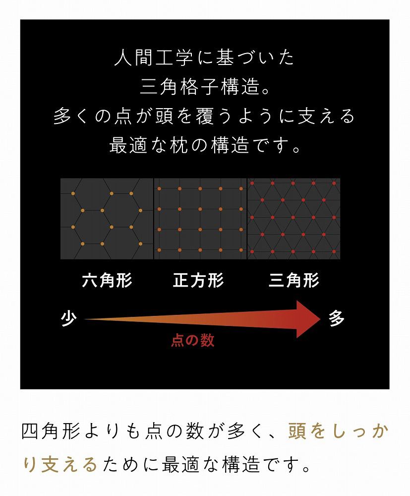 三角の格子形は点の数が多く、頭をしっかり支える為、枕に最適な構造です