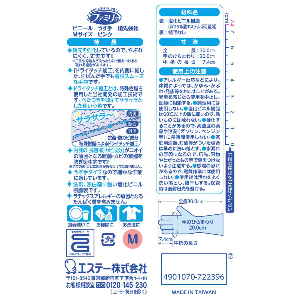 ファミリー ビニールうす手 指先強化 Mサイズ ピンク 1双 [家庭用手袋 指先強化でやぶれにくい ビニール手袋] ピンク ST72239