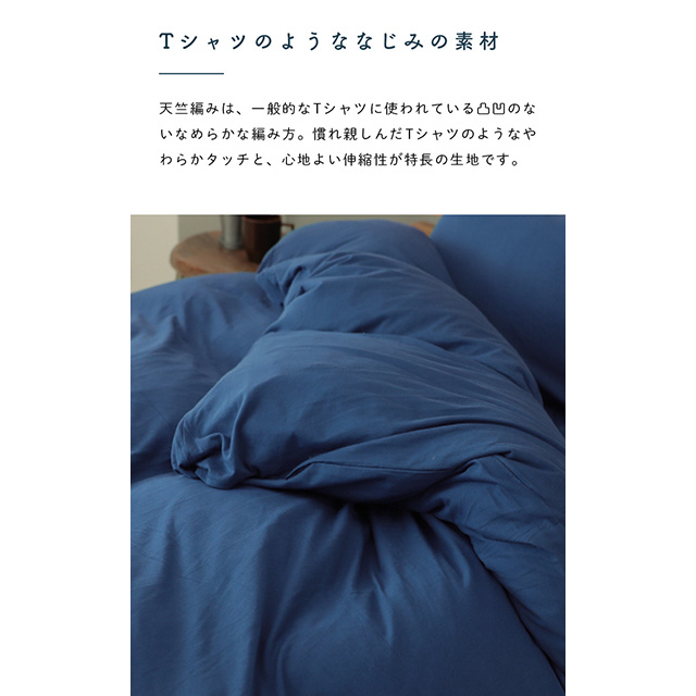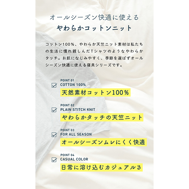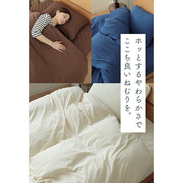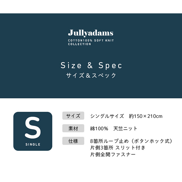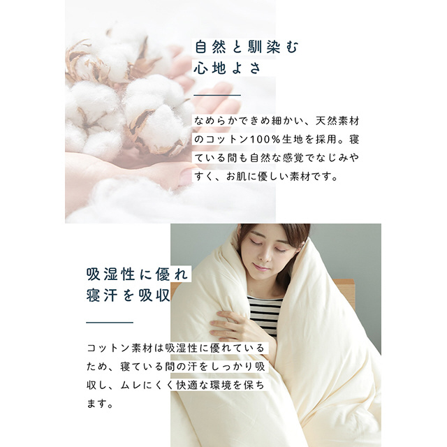肌が触れる表側は、吸湿性に優れたコットン100%素材を使用、季節問わずオールシーズンお使いいただけます。8ヵ所のループ止めはボタンフックを使用。また、手の届きにくいファスナー面の対面には3カ所のスリット付きで面倒なふとんとの取り付けも時間短縮します。