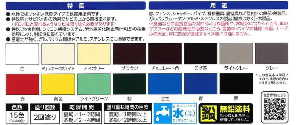 ●水性で塗りやすい低臭タイプの鉄部用塗料です。