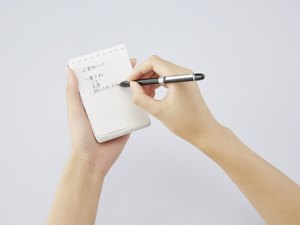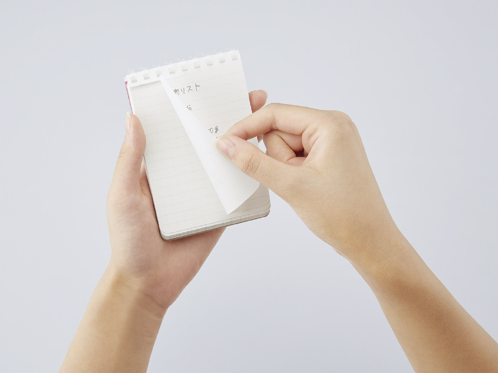 ●平らに開くので書き込みやすい、平らに折り返せるので狭い場所でも心地よく使える、といったリングメモのよさはそのままに、ポケットに入れてもかさばにくいこれからの新定番メモです。