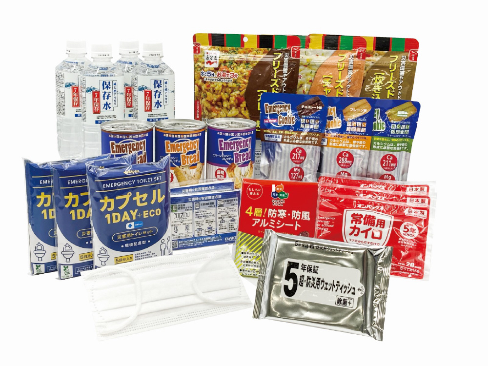 人気の3Daysライフカプセルをベースに加水調理用の水も追加して「しっかり食べる9食」をセットしました。内容品:保存水500ml×4、エマージェンシークッキー(チョコ・プレーン・抹茶)×各1、エマージェンシーブレッド(メープル・チョコ・ブルーベリー)×各1、フリーズドライご飯(炊き込み五目・チャーハン・カレー)×各1、簡易トイレ5回分×3、アルミブランケット×1、ウェットティッシュ×1、常備用カイロ×3、マスク×3、ポケットティッシュ×2