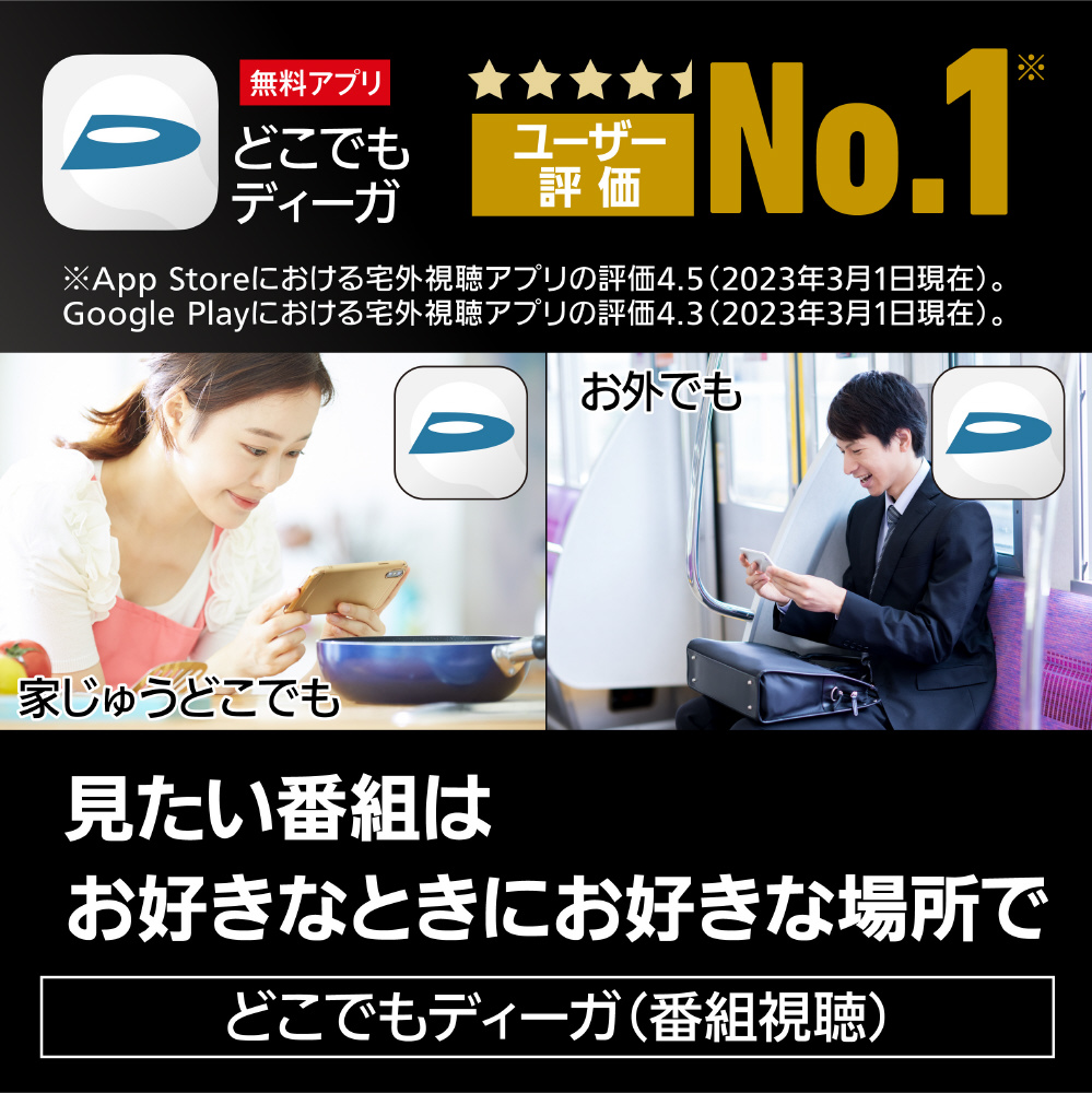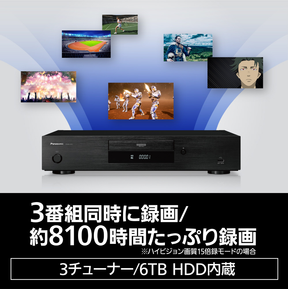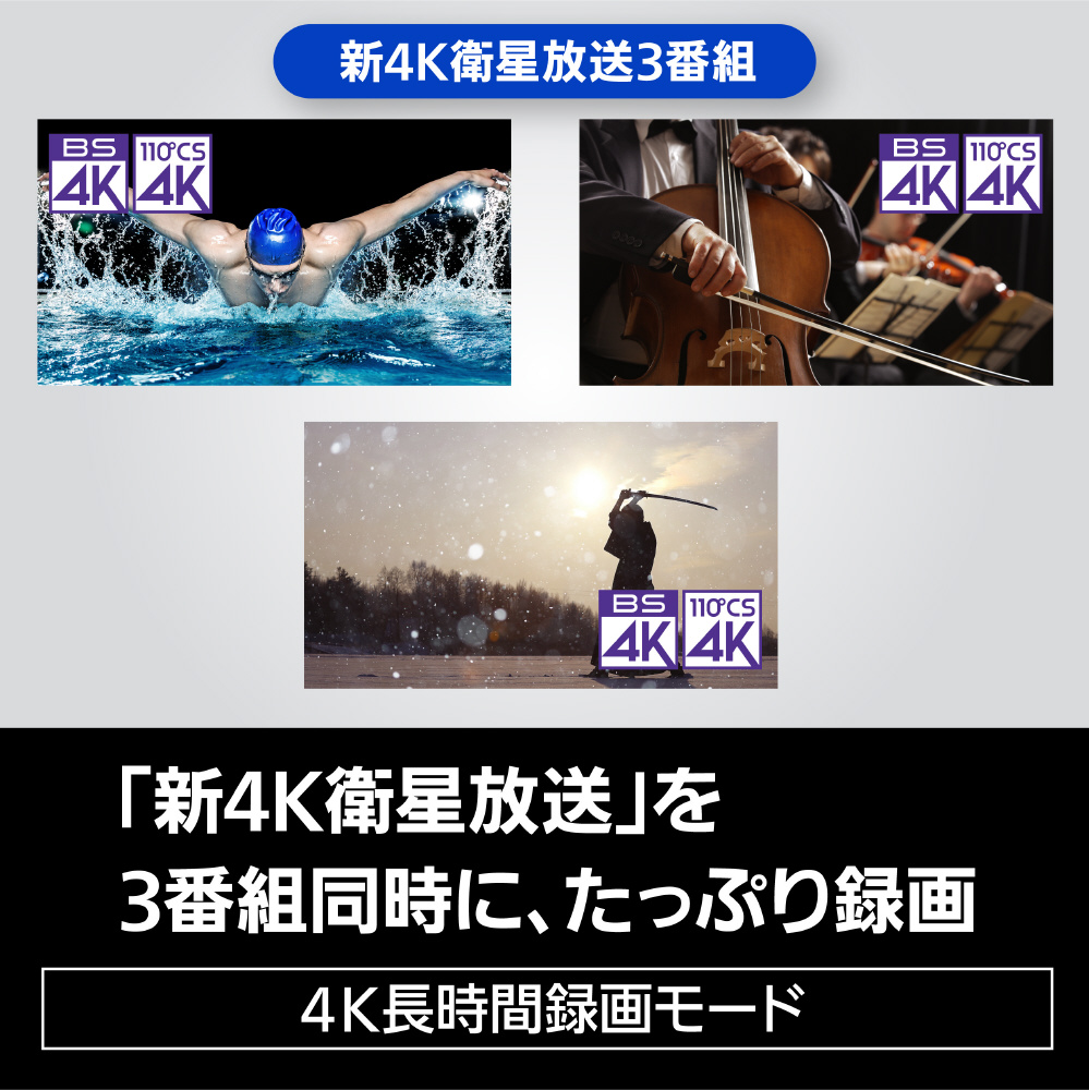 [HDR10+/Dolby Visionに関する注意事項]●HDR10+仕様で映像出力するには、レコーダー、コンテンツ、ディスプレイのすべてがHDR10+に対応している必要があります。●Dolby Vision仕様で映像出力するには、レコーダー、コンテンツ、ディスプレイのすべてがDolby Visionに対応している必要があります。●HDR10+仕様で映像出力をおこなっている場合はHDR関連の画質調整機能が無効になります。●Dolby Vision仕様で映像出力をおこなっている場合は画質調整機能が無効になります。※1:本機能はハードディスクやブルーレイディスクに記録した放送番組の再生時に対応しています。放送視聴時、インターネット動画視聴時、及び市販のブルーレイディスク再生時には対応していません。また、4K/24pや4K / 30pへの変換はメニューから選択する必要があり、自動変換はされません。※2:新4K衛星放送のHDR番組(HLG映像)には効果はありません。※3:2022年1月28日発売予定。民生用ブルーレイディスクレコーダーにおいて。※4:新4K衛星放送の録画・視聴・再生について●「新4K衛星放送」の番組は、USB2.0のUSBハードディスクまたはブルーレイディスクへの直接録画、DVDへの直接録画はできません。4KDRモード/4K長時間録画モードの録画番組は、SeeQVaultフォーマットのUSBハードディスクにダビングできません。ハイビジョン画質(1.5倍〜15倍録モード)に録画モード変換するとダビング可能です。●新4K衛星放送の3番組同時録画中は、録画中の番組以外の新4K衛星放送を視聴することはできません。地上デジタルやBS・CSデジタルの番組を新4K衛星放送対応チューナーで3番組同時録画中は、新4K衛星放送の視聴・録画はできません。USB3.0対応のUSBハードディスクに新4K衛星放送2番組を含む同時3 番組録画中は、USBハードディスク内の録画済み番組の再生はできません。新4K衛星放送の3 番組録画中およびL AN 録画中は、再生や編集はできません。新4K衛星放送の3 番組録画中は、録画モード変換はできません。●録画モードを「4K4.5倍録」から「4K 8〜12倍録」に設定して[BD-RE][BD-R]に画質変更ダビングはできません。いったん「録画モード変換」で「4K4.5倍録」から「4K 8〜12倍録」に変換したあと、高速ダビングしてください。●スマホ転送番組を記録した場合、録画できる時間は短くなります。※5:Ultra HD ブルーレイを再生するためには、著作権保護のために、ディスクによってはインターネットに接続していないと再生できない場合があります。・4K/60pをお楽しみになりたい場合は、18Gbps対応のHDMIケーブル(別売)が必要です。※6:ネットサービス事業者が提供するアプリは提供事業者の都合により、予告なく変更・停止・終了する場合があります。アプリの変更や終了にかかわるいかなる損害、損失に対しても当社は責任を負いません。また、アプリをご利用の際には機器本体のバージョンアップが必要となる場合があります。サービスの利用には別途登録・契約や料金が必要な場合があります。
