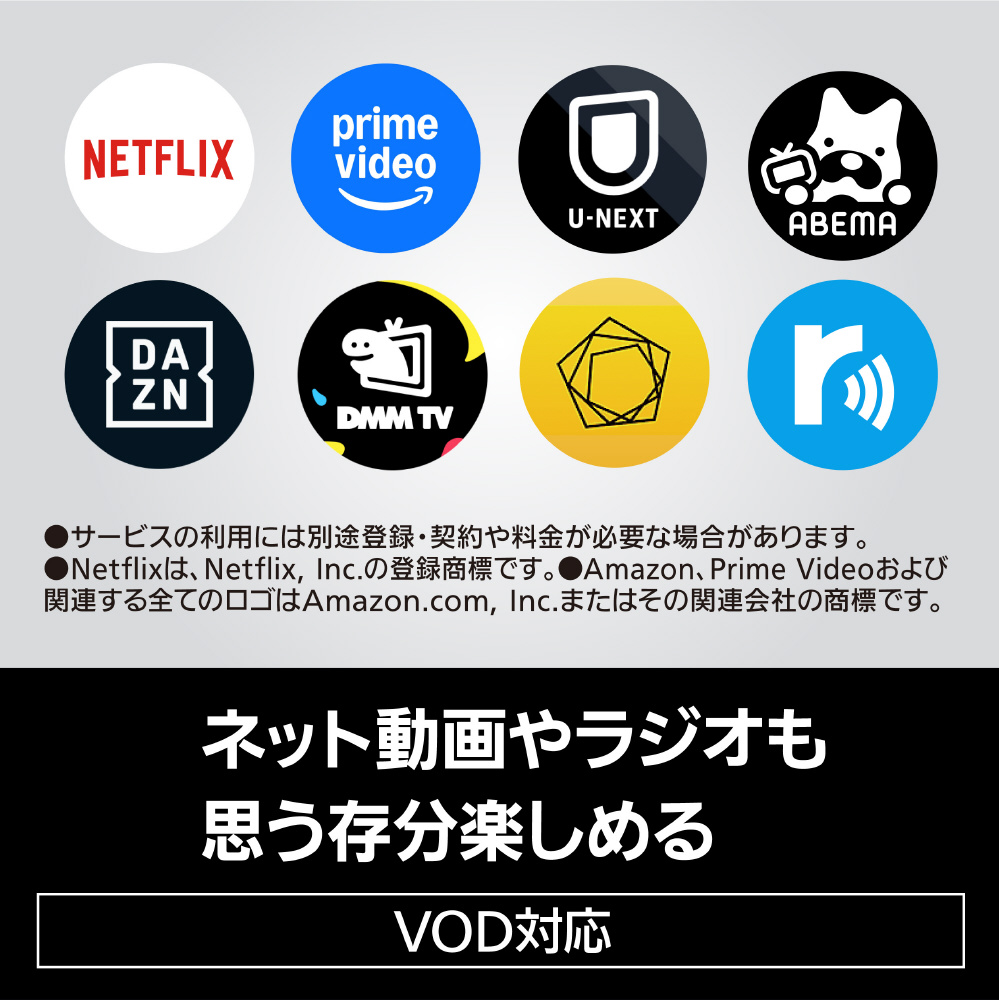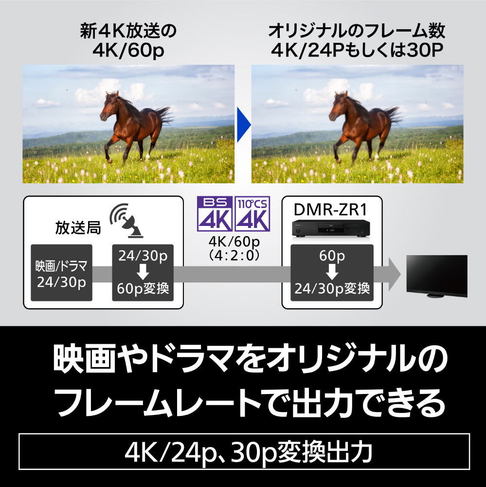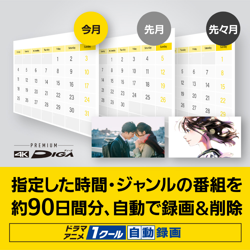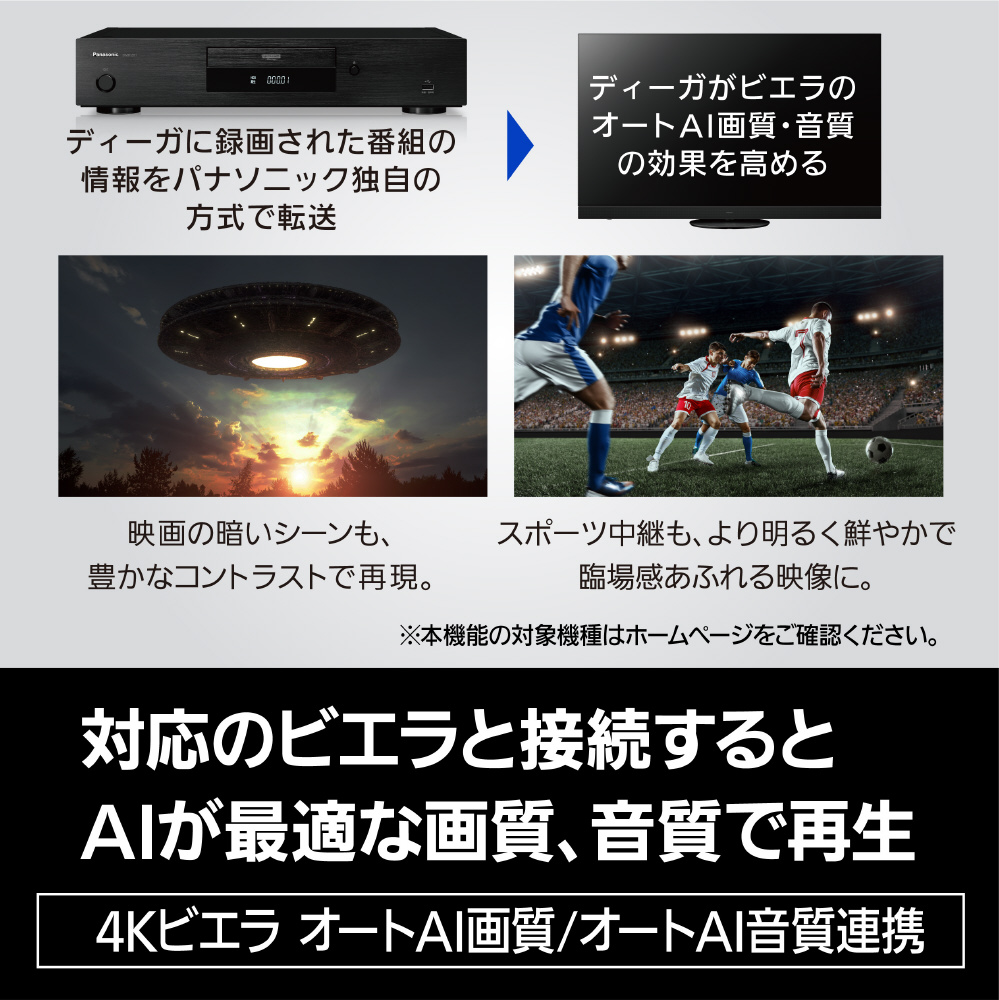 [HDR10+/Dolby Visionに関する注意事項]●HDR10+仕様で映像出力するには、レコーダー、コンテンツ、ディスプレイのすべてがHDR10+に対応している必要があります。●Dolby Vision仕様で映像出力するには、レコーダー、コンテンツ、ディスプレイのすべてがDolby Visionに対応している必要があります。●HDR10+仕様で映像出力をおこなっている場合はHDR関連の画質調整機能が無効になります。●Dolby Vision仕様で映像出力をおこなっている場合は画質調整機能が無効になります。※1:本機能はハードディスクやブルーレイディスクに記録した放送番組の再生時に対応しています。放送視聴時、インターネット動画視聴時、及び市販のブルーレイディスク再生時には対応していません。また、4K/24pや4K / 30pへの変換はメニューから選択する必要があり、自動変換はされません。※2:新4K衛星放送のHDR番組(HLG映像)には効果はありません。※3:2022年1月28日発売予定。民生用ブルーレイディスクレコーダーにおいて。※4:新4K衛星放送の録画・視聴・再生について●「新4K衛星放送」の番組は、USB2.0のUSBハードディスクまたはブルーレイディスクへの直接録画、DVDへの直接録画はできません。4KDRモード/4K長時間録画モードの録画番組は、SeeQVaultフォーマットのUSBハードディスクにダビングできません。ハイビジョン画質(1.5倍〜15倍録モード)に録画モード変換するとダビング可能です。●新4K衛星放送の3番組同時録画中は、録画中の番組以外の新4K衛星放送を視聴することはできません。地上デジタルやBS・CSデジタルの番組を新4K衛星放送対応チューナーで3番組同時録画中は、新4K衛星放送の視聴・録画はできません。USB3.0対応のUSBハードディスクに新4K衛星放送2番組を含む同時3 番組録画中は、USBハードディスク内の録画済み番組の再生はできません。新4K衛星放送の3 番組録画中およびL AN 録画中は、再生や編集はできません。新4K衛星放送の3 番組録画中は、録画モード変換はできません。●録画モードを「4K4.5倍録」から「4K 8〜12倍録」に設定して[BD-RE][BD-R]に画質変更ダビングはできません。いったん「録画モード変換」で「4K4.5倍録」から「4K 8〜12倍録」に変換したあと、高速ダビングしてください。●スマホ転送番組を記録した場合、録画できる時間は短くなります。※5:Ultra HD ブルーレイを再生するためには、著作権保護のために、ディスクによってはインターネットに接続していないと再生できない場合があります。・4K/60pをお楽しみになりたい場合は、18Gbps対応のHDMIケーブル(別売)が必要です。※6:ネットサービス事業者が提供するアプリは提供事業者の都合により、予告なく変更・停止・終了する場合があります。アプリの変更や終了にかかわるいかなる損害、損失に対しても当社は責任を負いません。また、アプリをご利用の際には機器本体のバージョンアップが必要となる場合があります。サービスの利用には別途登録・契約や料金が必要な場合があります。