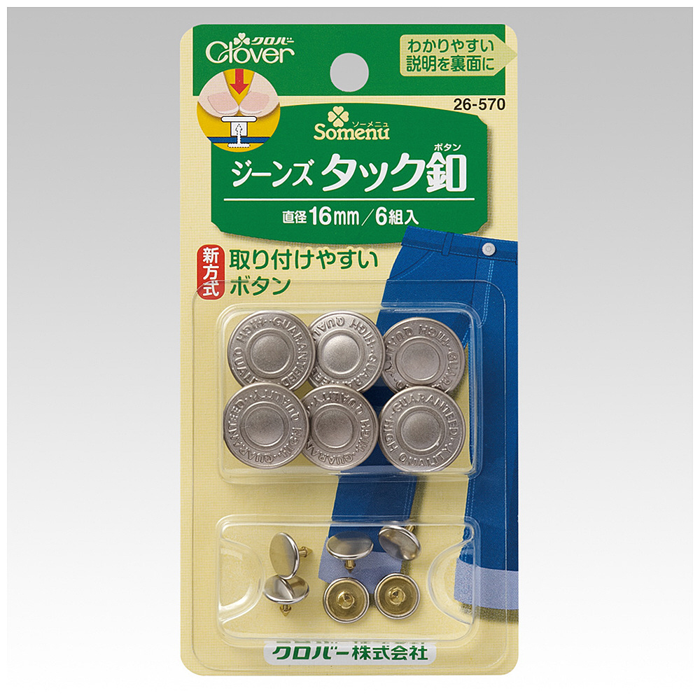 指でボタンにピンを押しこみ、最後は木ヅチなどで軽くたたくだけで簡単に取りつけられる新方式タックボタンです。