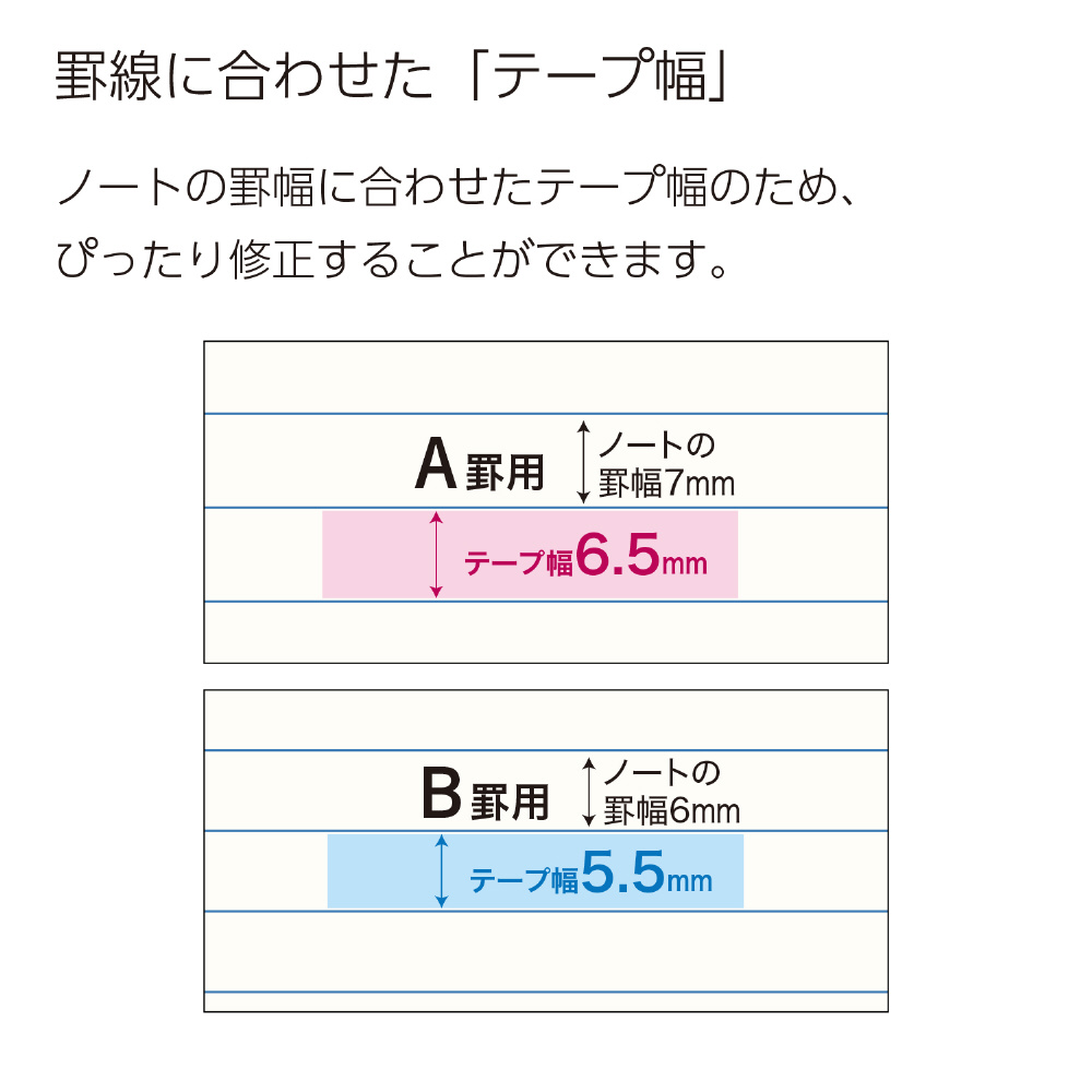 ●ノートの罫幅に合わせたテープ幅のため、ぴったり修正することができます。A罫・B罫からお選びいただけます。