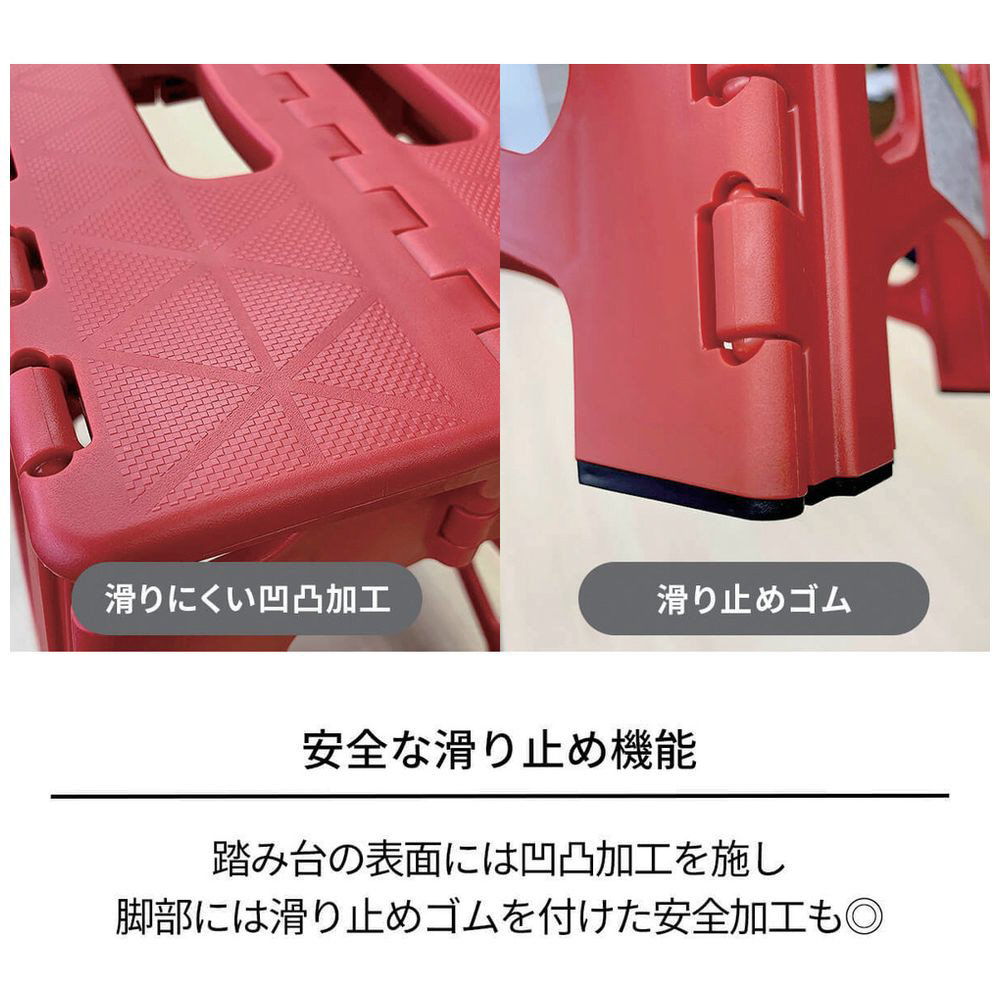 踏み台の表面には凹凸加工を施し、脚部には滑り止めゴムを付けて滑りにくくしています。