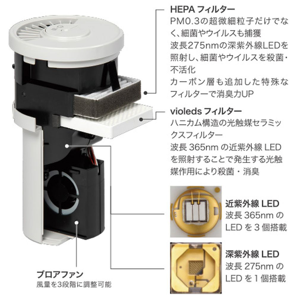 ■高出力の深紫外線LEDとカーボン層一体型の特殊HEPAフィルターを採用し、性能が向上。