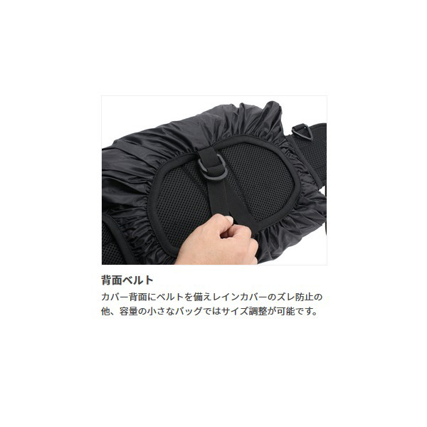 カバー背面にベルトを備えレインカバーのズレ防止の他、容量の小さなバッグではサイズ調整が可能です。