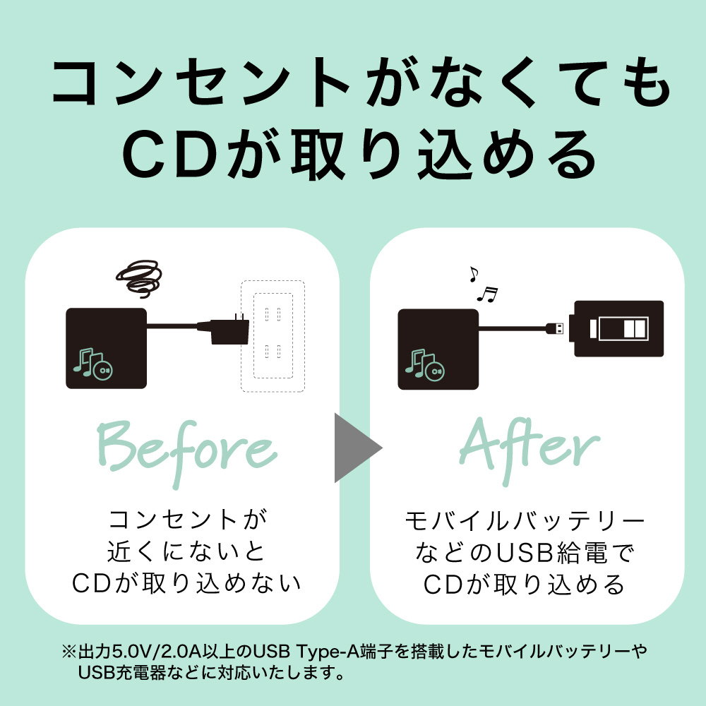 モバイルバッテリーからの給電はもちろん、車のUSBポートやシガーソケット、スマホ用充電器のUSBポートからの給電も可能です。より場所を選ばずにCDを取り込めます。