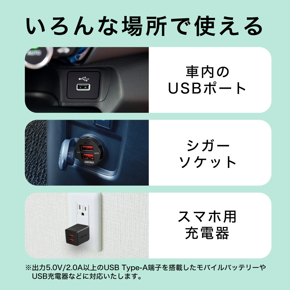 *「出力5.0V/2.0A以上のUSB Type-A端子」を搭載したモバイルバッテリーやUSB充電器などに接続してご利用ください。(この条件を満たすすべての機器での動作を保証するものではありせん。)