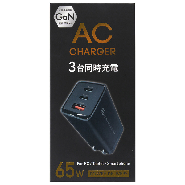 PowerDelivery(PD)対応USB-AC充電器 65W 3ポート(Type-C×2+USB-A×1) GaN使用 PPS出力対応 ブラック ACUC2M65ADBK