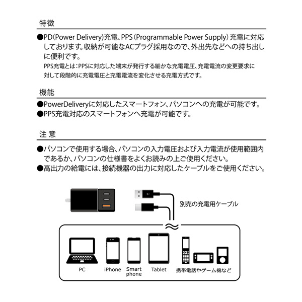 ■PD(PowerDelivery)充電、PPS(ProgrammablePowerSupply)充電に対応しております。※PPS充電とはPPSに対応した端末が発行する細かな充電電圧、充電電流の変更要求に対して段階的に充電電圧と充電電流を変化させる充電方式です。■Type-C1のみを使用した場合はPD最大65Wで充電致します。(1.5V/3A、9V/3A、12V/3A、15V/3A、20V/3.25A、PPS出力:3.3V-21V/3A)■Type-C2のみを使用した場合はPD最大30Wで充電致します。(2.5V/3A、9V/3A、12V/2.5A、15V/2A、20V/1.5A、PPS出力:3.3V-11V/3A、3.3V-16V/2A)■USB-Aのみを使用した場合は最大30Wで充電します。(4.5V/5A、5V/4.5A、9V/3A、12V/2.5A、20V/1.5A)■3台同時充電した場合はType-C1はPD最大45Wで充電しType-C2、USB-Aは合計最大15Wで充電します。(Type-C1:5V/3A、9V/3A、12V/3A、20V/2.25A、PPS出力:3.3V-16V/3A Type-C2:2.5V/3A ■Type-C1、Type-C2を同時充電した場合はType-C1はPD最大45Wで充電しType-C2はPD最大18Wで充電します。(Type-C1:5V/3A、9V/3A、12V/3A、20V/2.25A、PPS出力:3.3V-16V/3A Type-C2:2.5V/3A、9V/2A、12V/1.5A、15V/1.2A、20V/0.9A、PPS出力:3.3V-5.9V/3A、3.3V-11V/2A)USB-A: 5V/2.4A)■Type-C1、USB-Aを同時充電した場合はType-C1はPD最大45Wで充電しUSB-Aは最大18Wで充電します。(Type-C1:5V/3A、9V/3A、12V/3A、20V/2.25A、PPS出力:3.3V-16V/3A USB-A:5V/3A、9V/2A、12V/1.5A)■Type-C2、USB-Aを同時充電した場合はType-C2、USB-Aは合計最大15Wで充電します。(Type-C2:2.5V/3A USB-A: 5V/2.4A)※ノートパソコンで使用する場合、ノートパソコンの入力電圧および入力電流が使用範囲内であるか、ノートパソコンの仕様書をよくお読みの上ご使用下さい。また高出力の給電には、接続機器の出力に対応したケーブルをご使用ください。