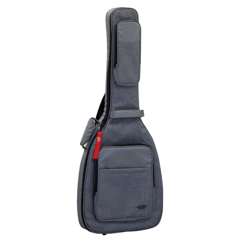 スタイリッシュなグレーの生地を使用した都会的な印象のギグバッグです。内装は綿ビロードのリッチで優しい生地を採用し、20 mm厚のクッションが優しく楽器を保護します。ヘッド部にロングポケット、ボディ部にA4クリアファイルも余裕で収納可能なポケットと、さらにその外側にシールドなどを収納するのに便利なポケットを装備し充分な収納力。背中の当たる箇所にもクッションを搭載し、快適に移動できます。サイドと前面の持ち手は柔らかなクッションを搭載し、手の負担を軽減します。