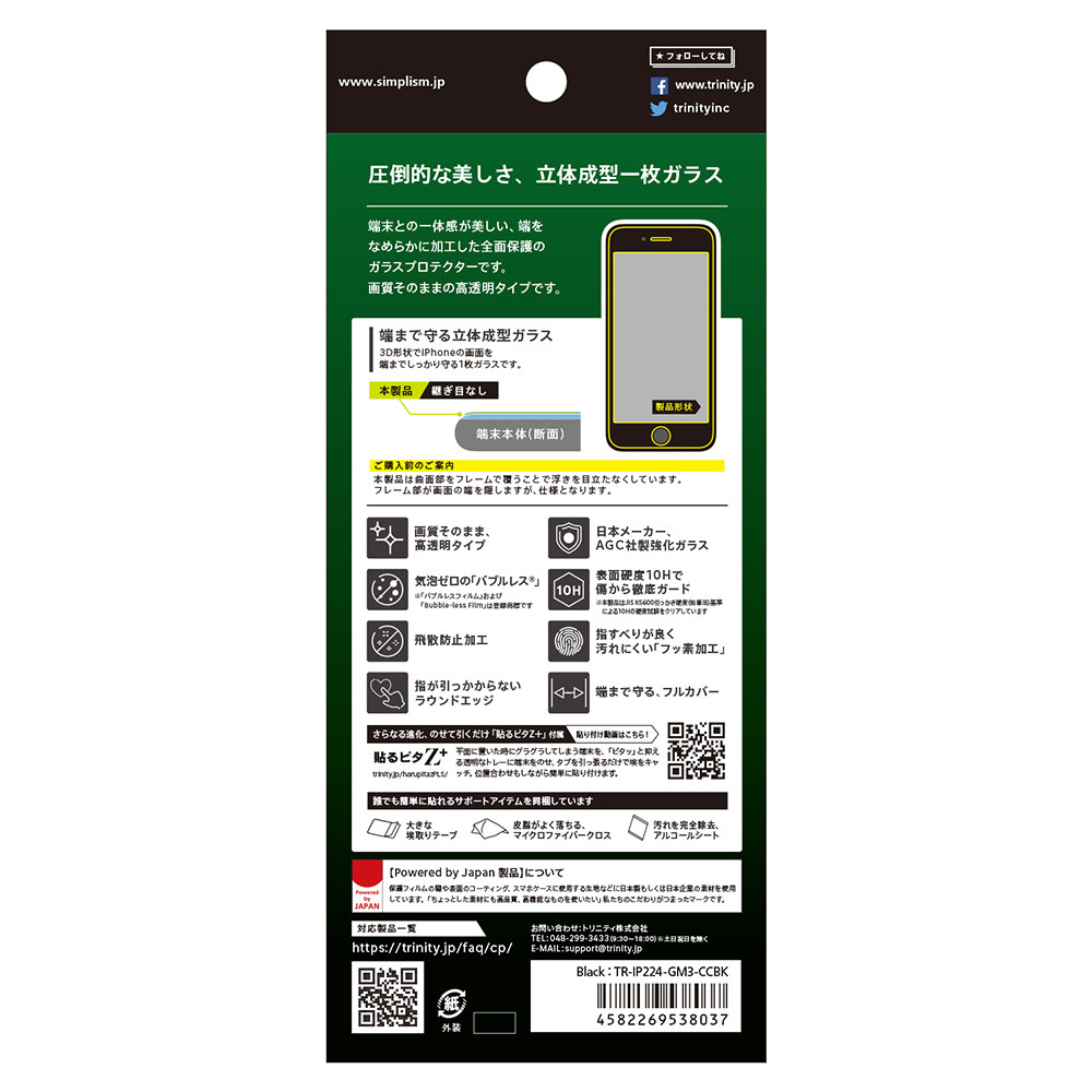 AGC社製の強化ガラス採用。まるで貼っていないような一体感。3D立体成型の全面保護のガラスプロテクター。高透明タイプ