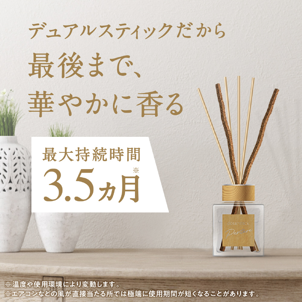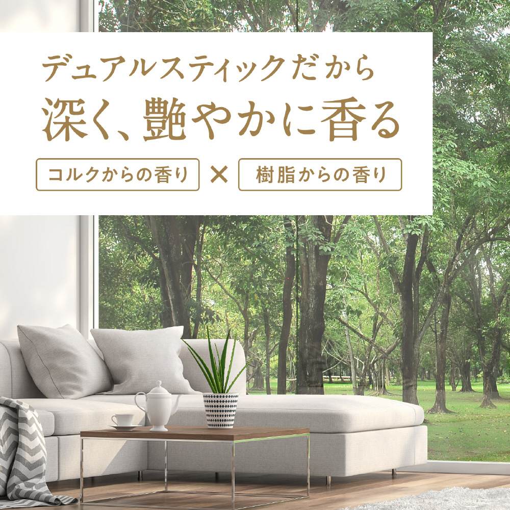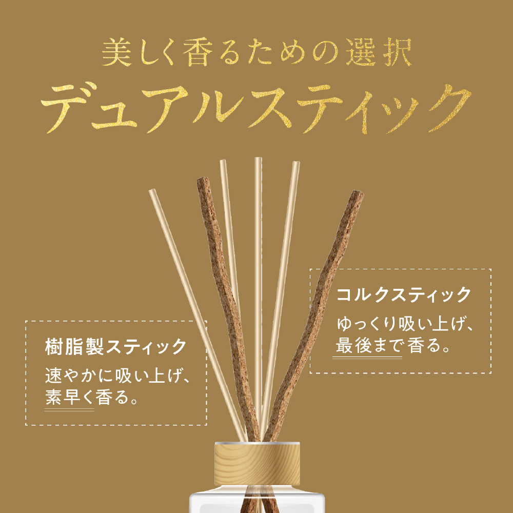 ・樹脂製スティックと最後までしっかり香りを広げるコルクスティックを採用。2つの素材が奥ゆきのある香りを織りなし、使いはじめから使い終わりまで上質な香りを楽しめます。