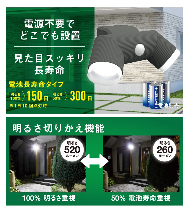 乾電池式で見た目スッキリ 明るさ切替え機能付き