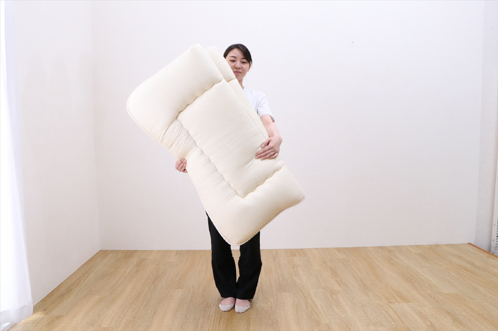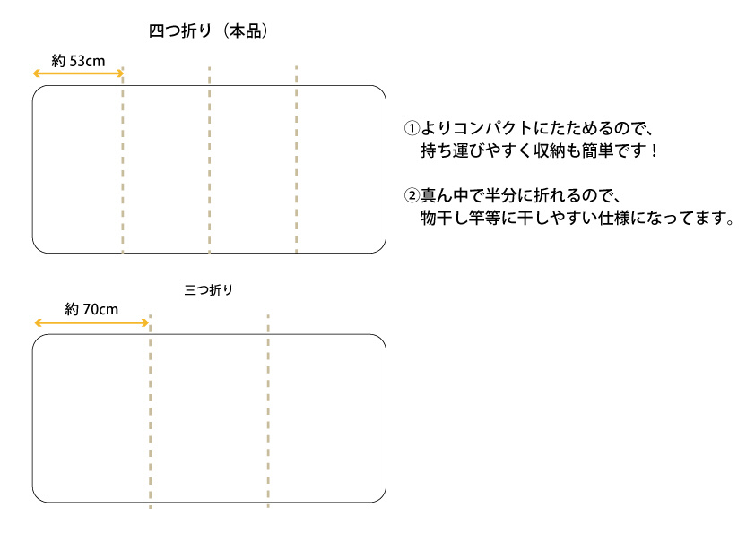 4つ折りしやすいよう縫われているため、コンパクトで運びやすくクローゼットや押し入れにもしまいやすいサイズです。干すときは中央で折り曲げて干すことができます。